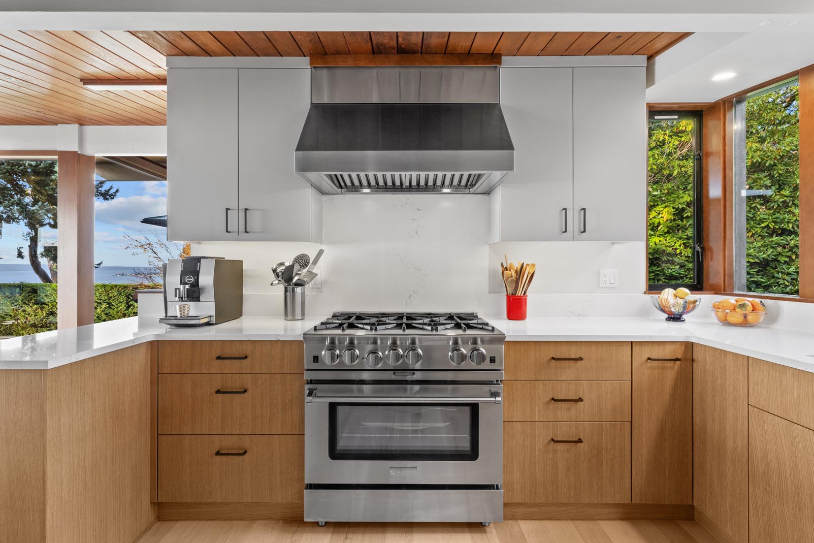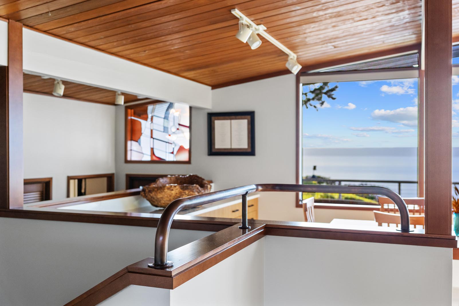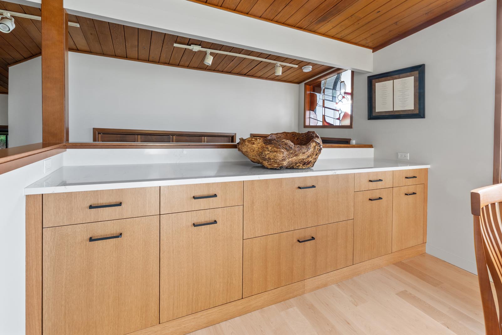 To further enhance flow and maximize natural beauty, a section of wall between the kitchen and dining room landing was removed. This transformation opened up the space and created uninterrupted sightlines to Puget Sound and Vashon Island. Outdated oak cabinetry from a 1970s addition was removed and replaced with matching custom cabinetry, visually uniting the kitchen and dining areas into one cohesive, light-filled space.