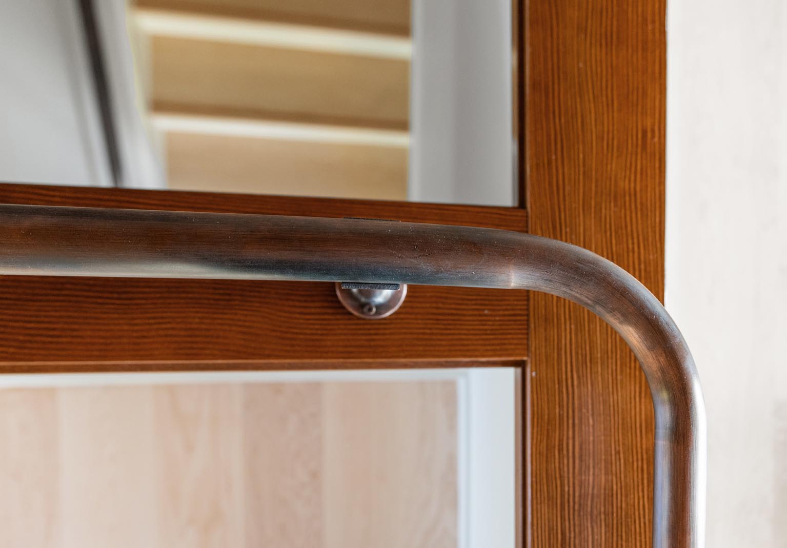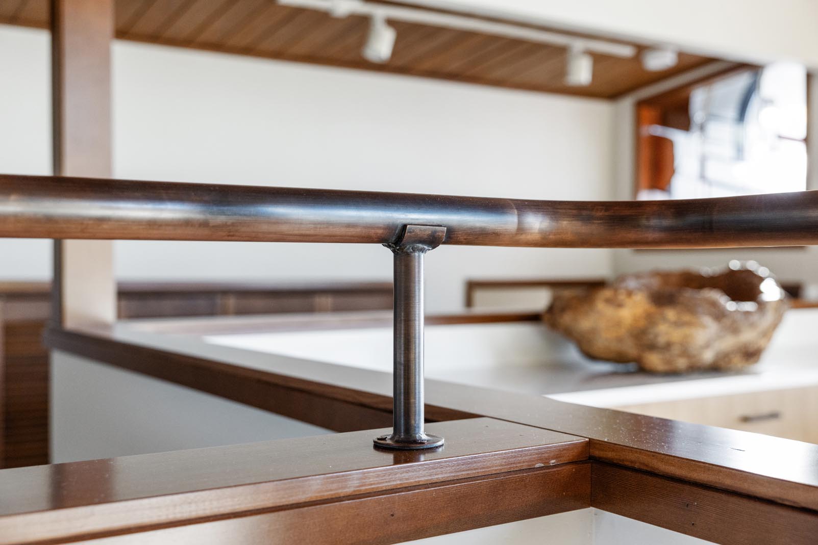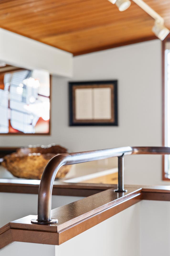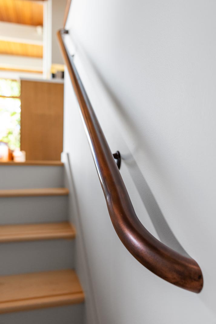 Finishing details were equally intentional. Baseboards and millwork were unified throughout the home, eliminating mismatched profiles and finishes. Oak wall caps and handrails from a past remodel were replaced with pre-stained Douglas Fir to complement the existing trim. Custom copper handrails, fabricated by Master Fab, were installed on both staircases and along the kitchen landing, where wall heights were raised to meet modern code requirements while adding a refined, custom touch.