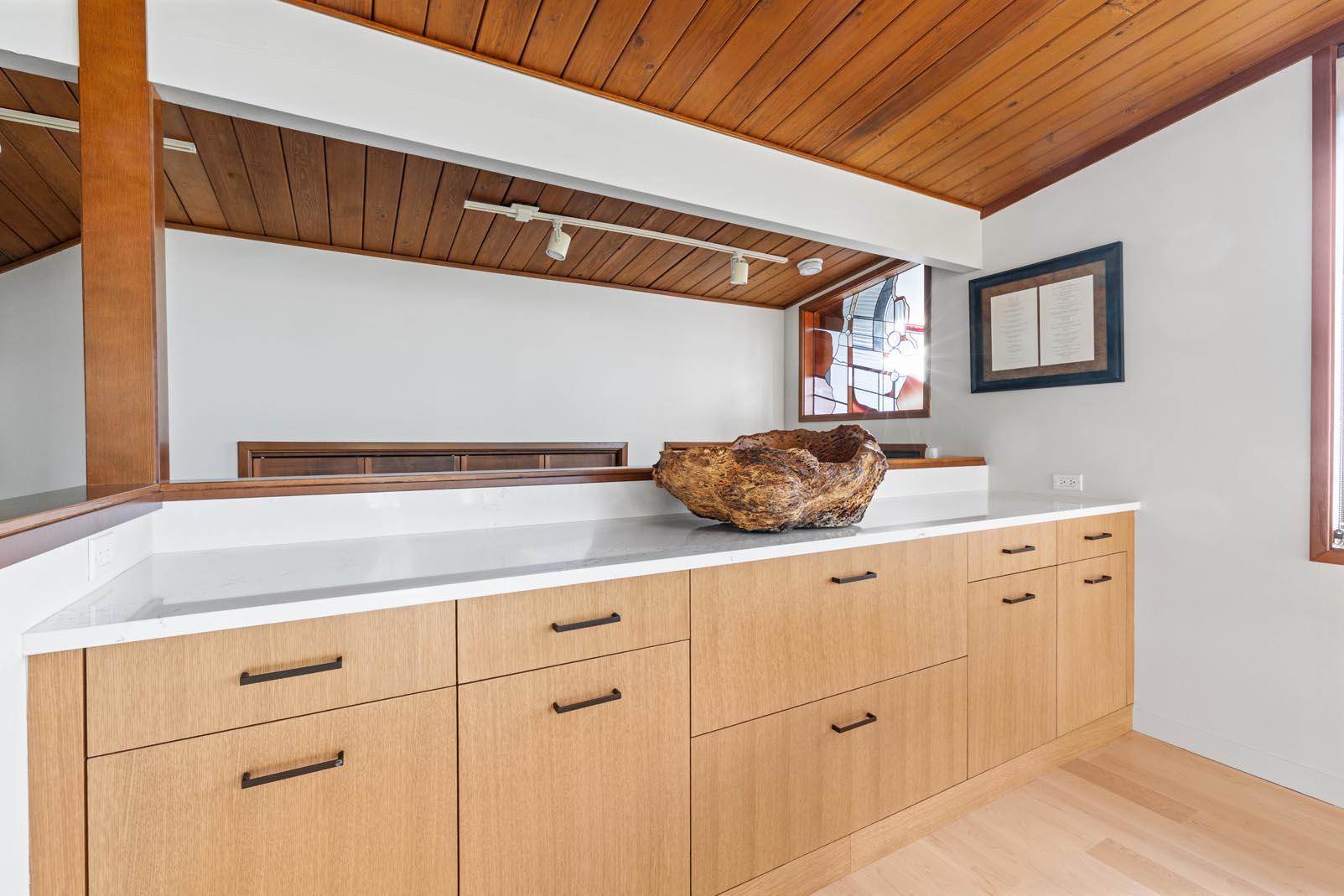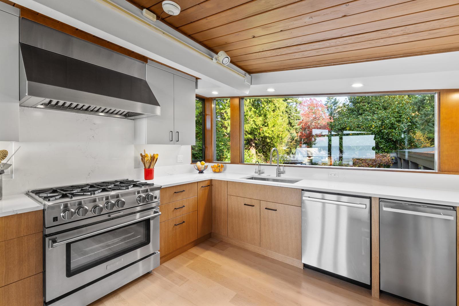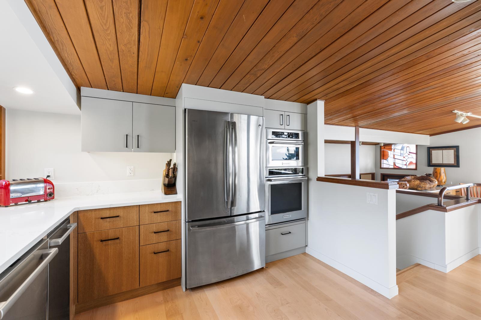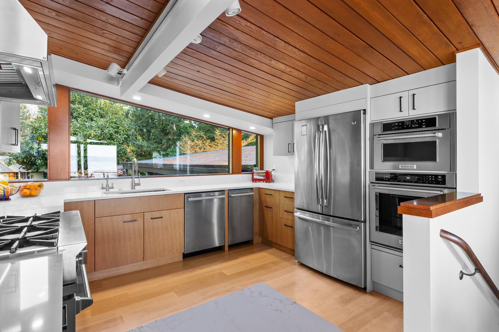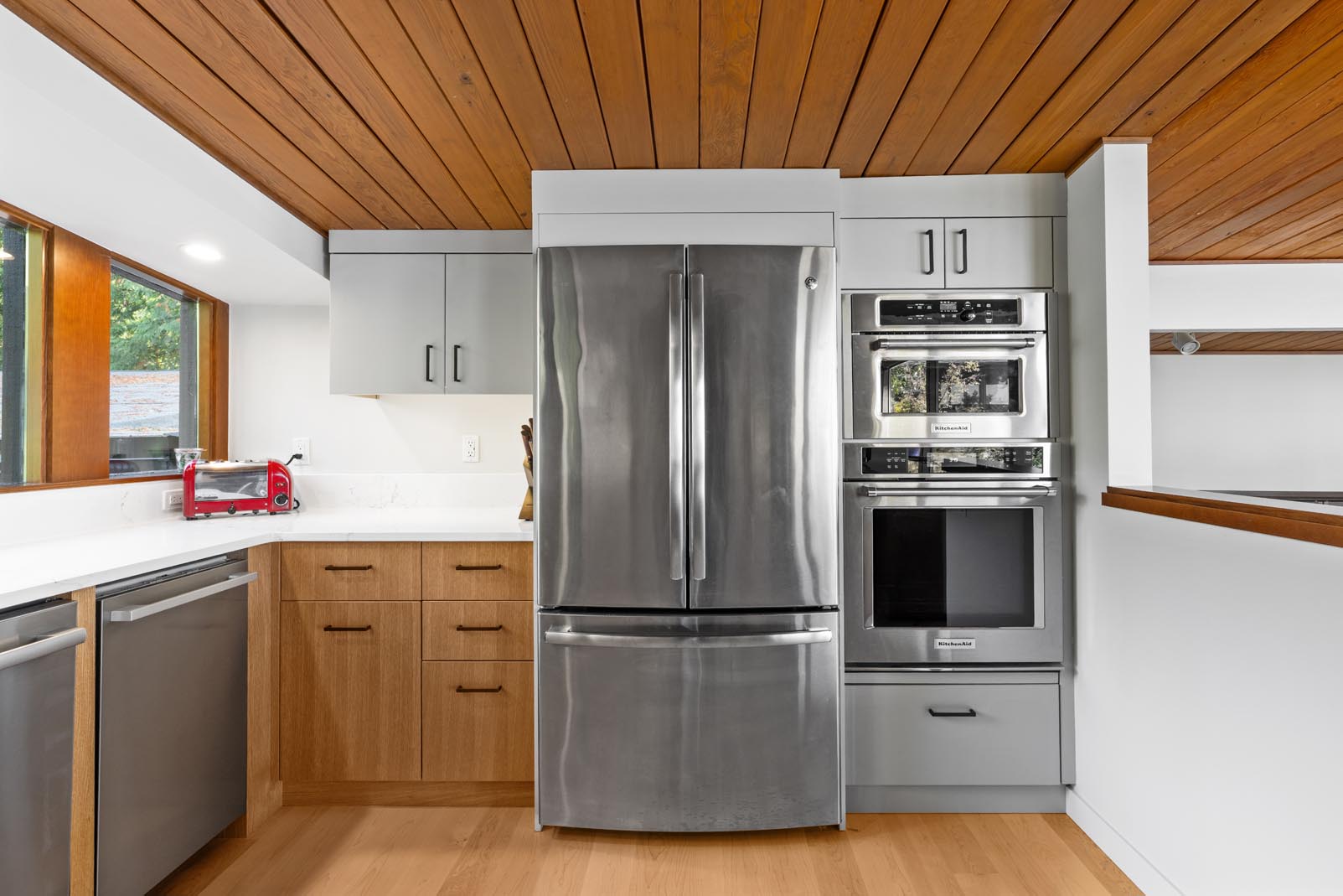 The kitchen bump-out was also completely reworked. A garden-style window system from a previous renovation clashed with the home’s mid-century modern aesthetic and suffered from poor insulation and water intrusion. We removed the existing window assembly, extended the roofline to match the original architecture, and rebuilt the walls. The new design features a large central picture window flanked by smaller windows, along with a north-facing casement window that brings in fresh air while framing the surrounding landscape.