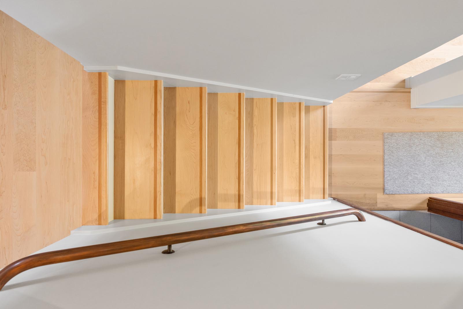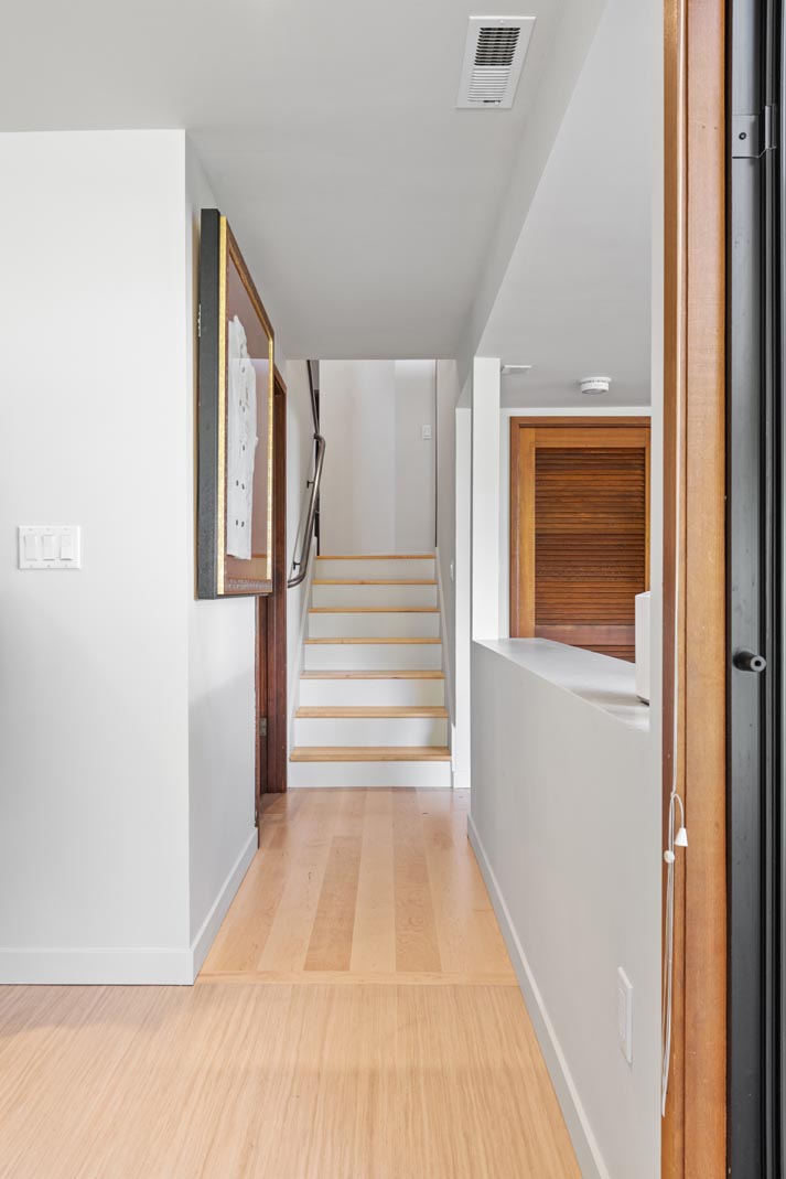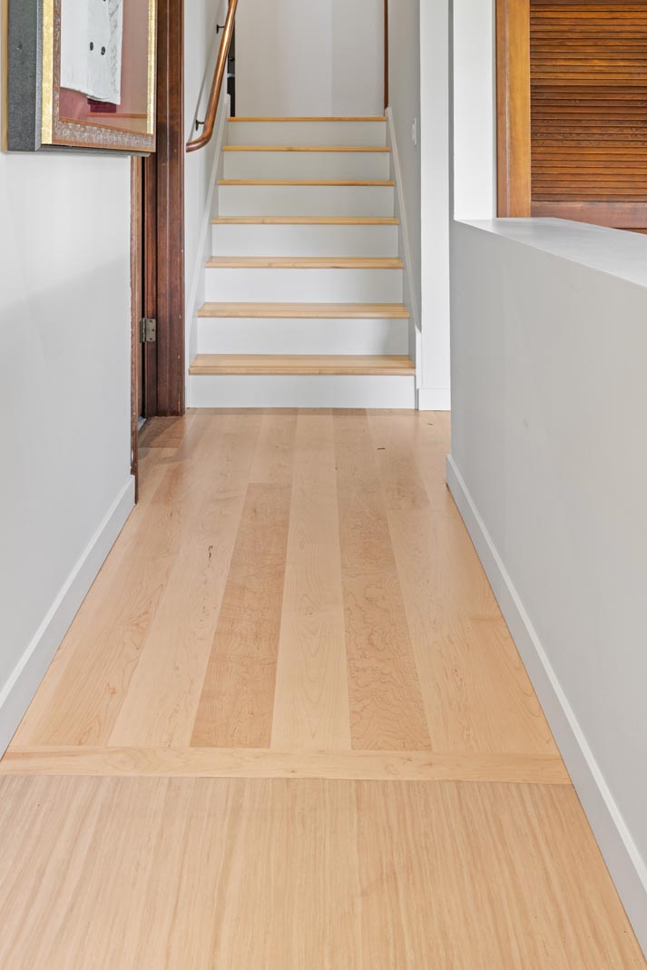 Throughout the home, the original 1950s oak flooring was replaced with a lighter maple floor to brighten the interior and modernize the space. To subtly reflect the movement of Puget Sound, select pieces of Birdseye Maple were incorporated, with their natural figuring evoking the water’s currents and whitecaps. Because portions of the home required engineered flooring over concrete, sourcing perfectly matched maple and Birdseye maple presented a challenge. Lane Hardwood Flooring exceeded expectations by coordinating custom fabrication to ensure a flawless result.