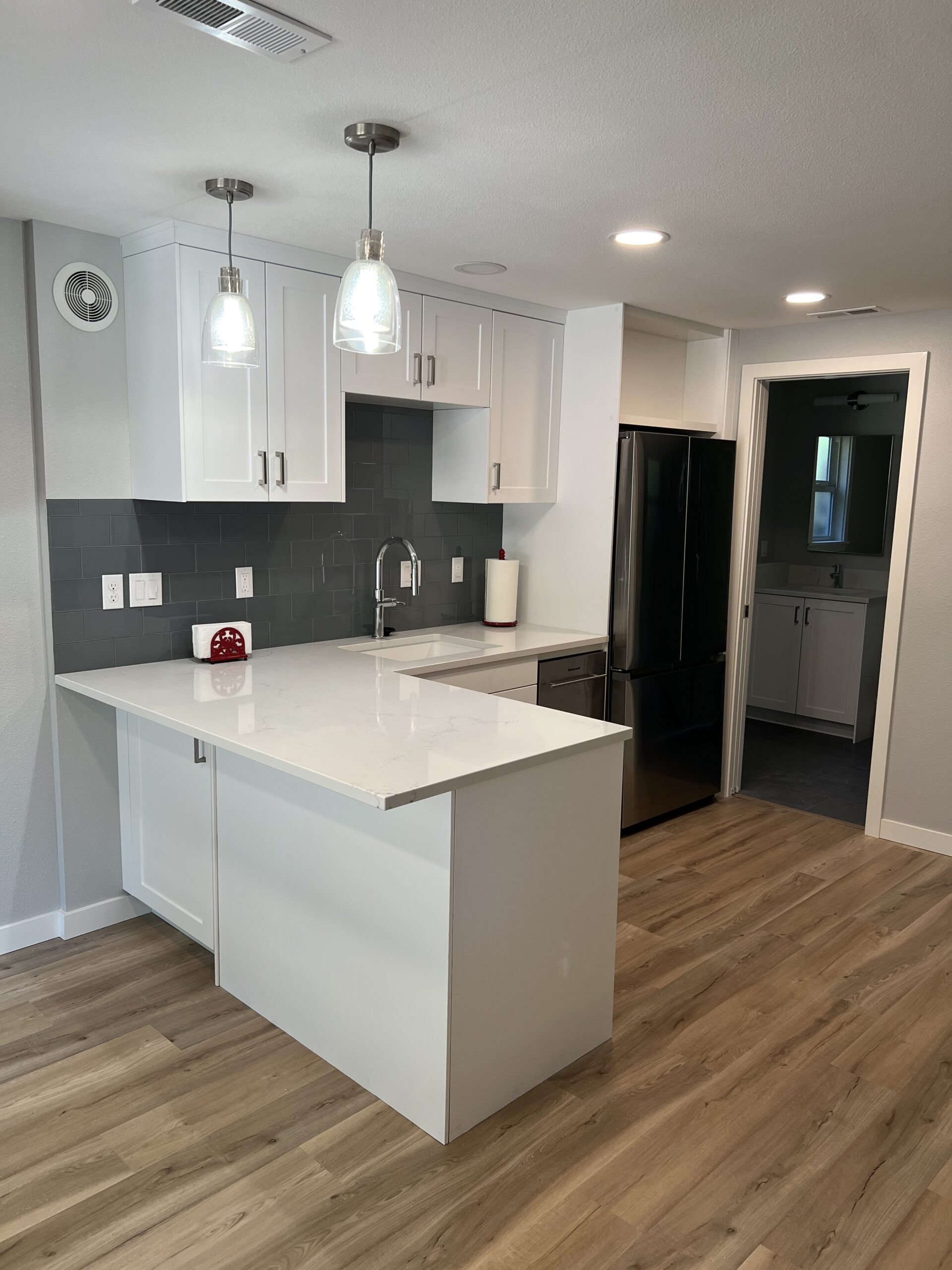 Materials used: Bellmont cabinets, LVP, quartz, tile, Delta plumbing, Kohler sinks
