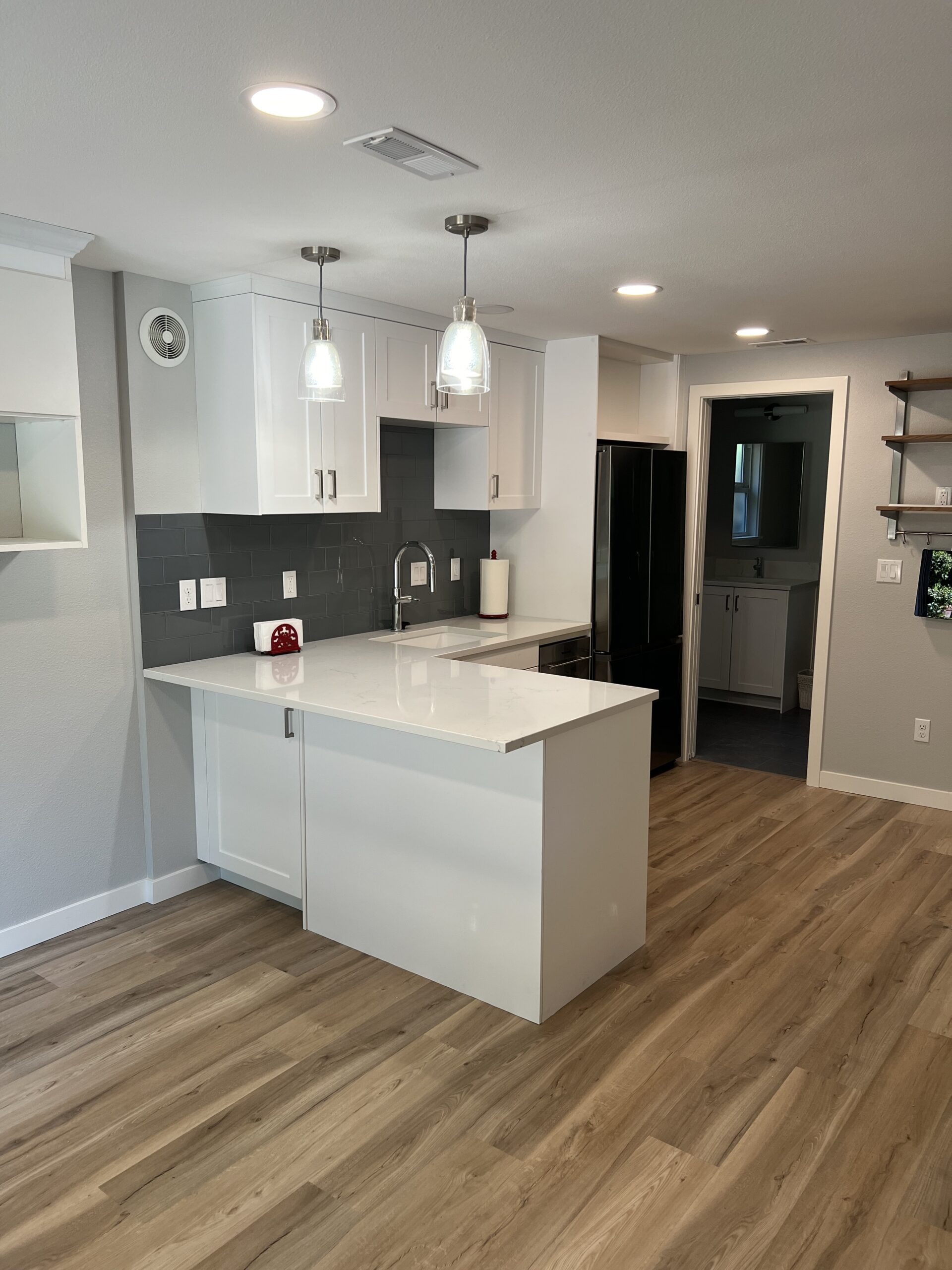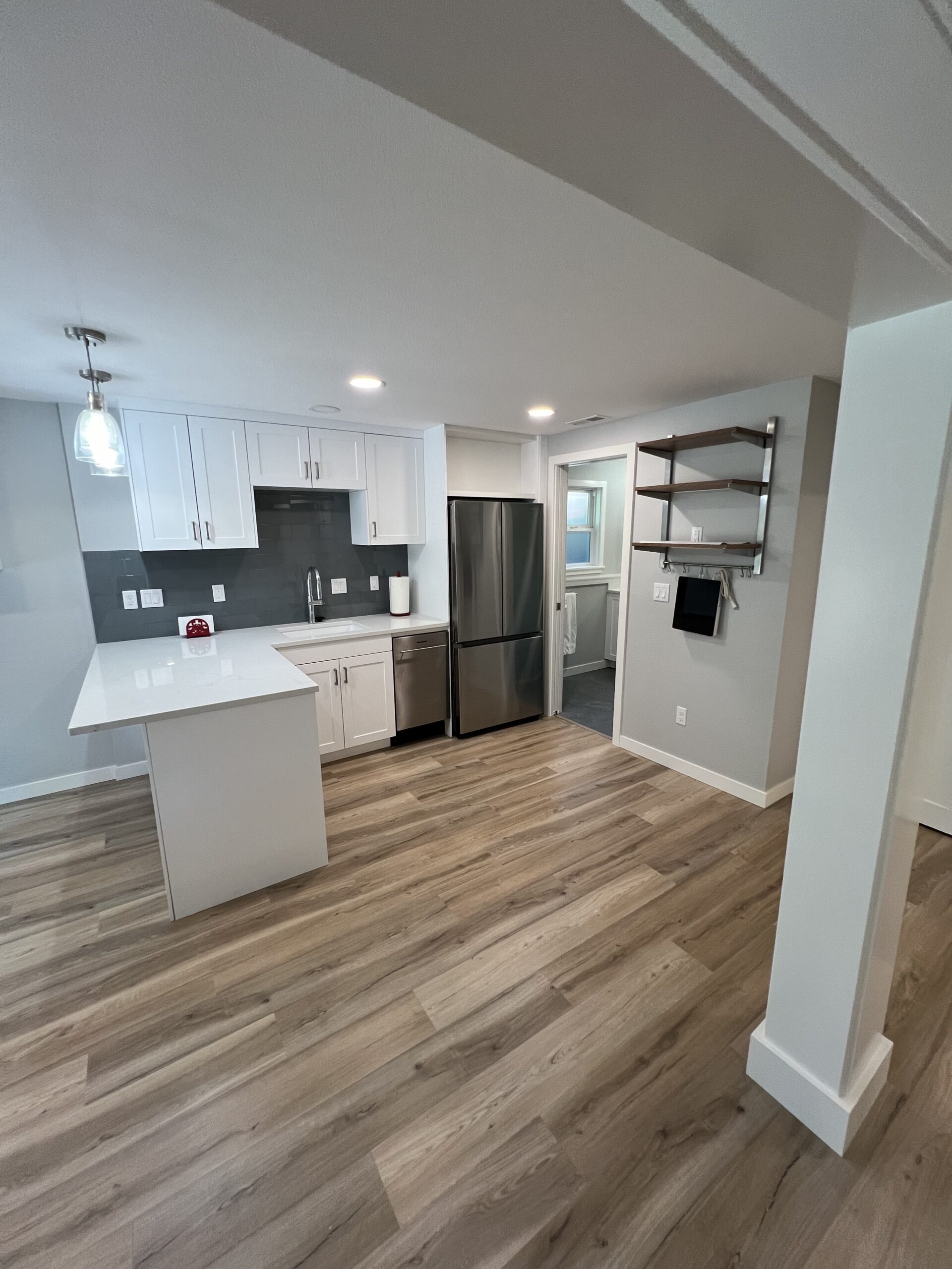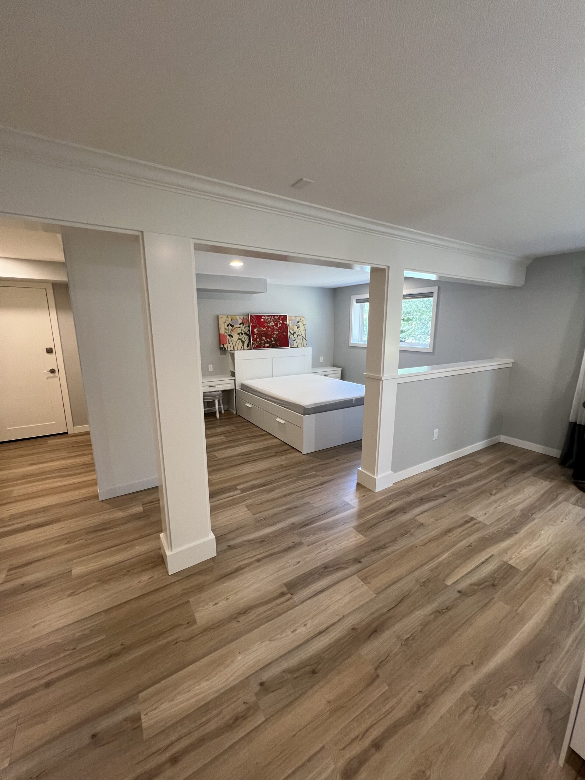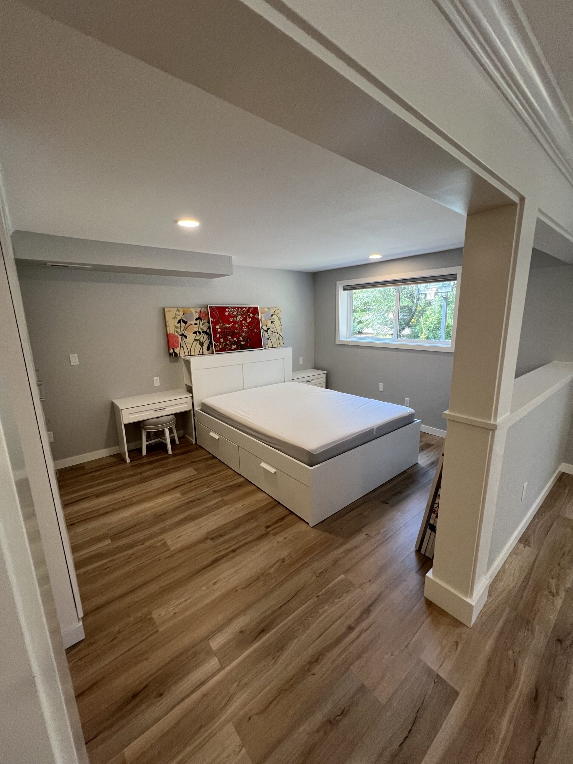 The client was looking to upgrade a basement area which included a divided living and sleeping area, large laundry/storage room and awkward bathroom into an ADU space for his mother. Design changes included swapping existing living and sleeping areas, rearranging the bathroom, reducing the size of the laundry room and adding a kitchenette. Existing free-standing closet system was repurposed to create a new sleeping area where the existing living room was and the existing sleeping area was modified to include a small living area for watching TV and addition of a new kitchenette with refrigerator, sink, dishwasher, microwave and small eating peninsula. A small hot plate will allow for simple meal preparation. The original bathroom included a pedestal sink, toilet (that was positioned so the tank was partially inset in an interior wall) and small 32”x32” shower. The reconfigured bathroom includes a full vanity, inset medicine cabinet mirror, toilet (which is entirely in the room) and a full-size 60”x36” shower. All new floors throughout (LVP in living area and tile in bathroom), new cabinets, millwork, lighting and paint.