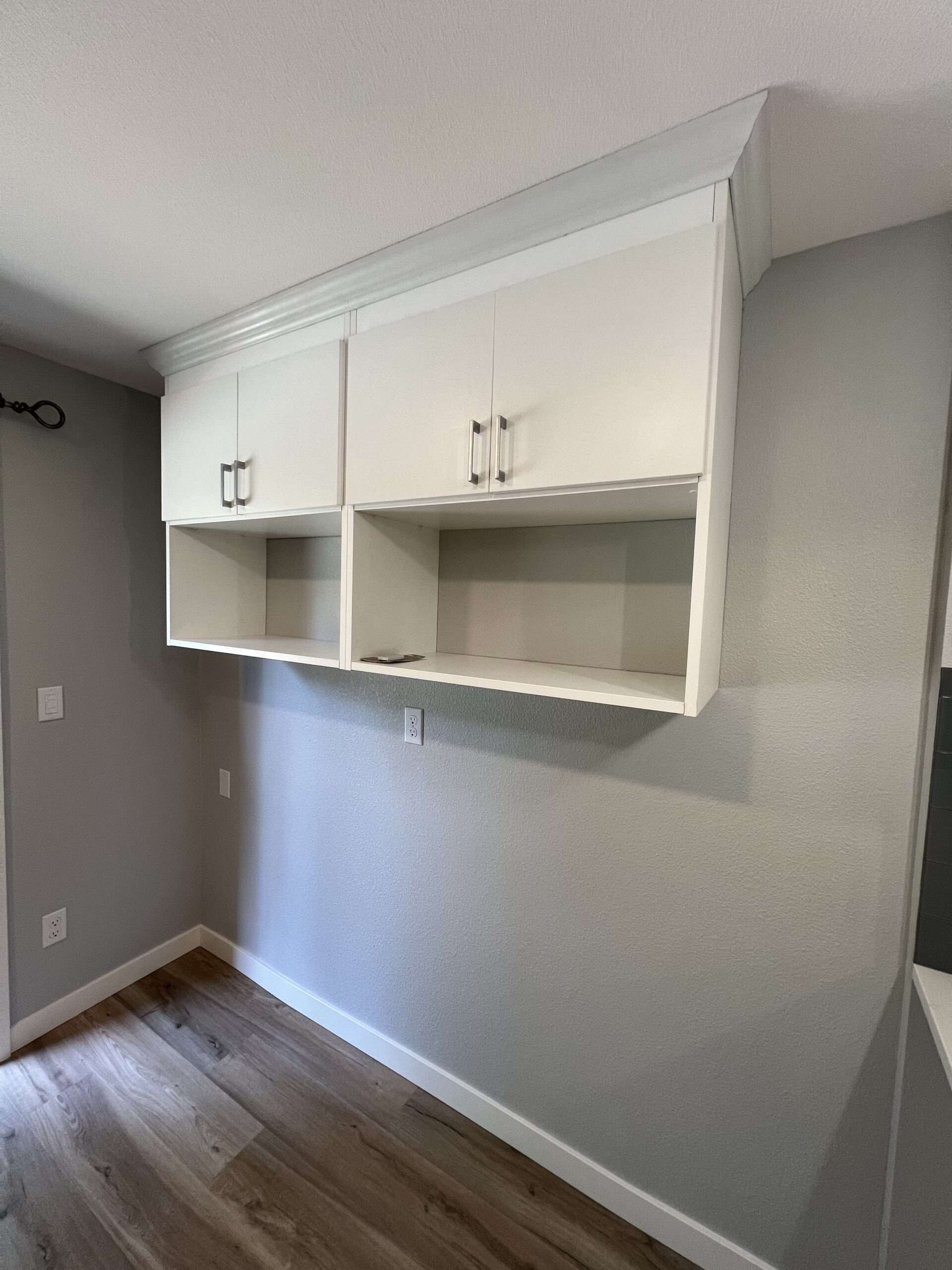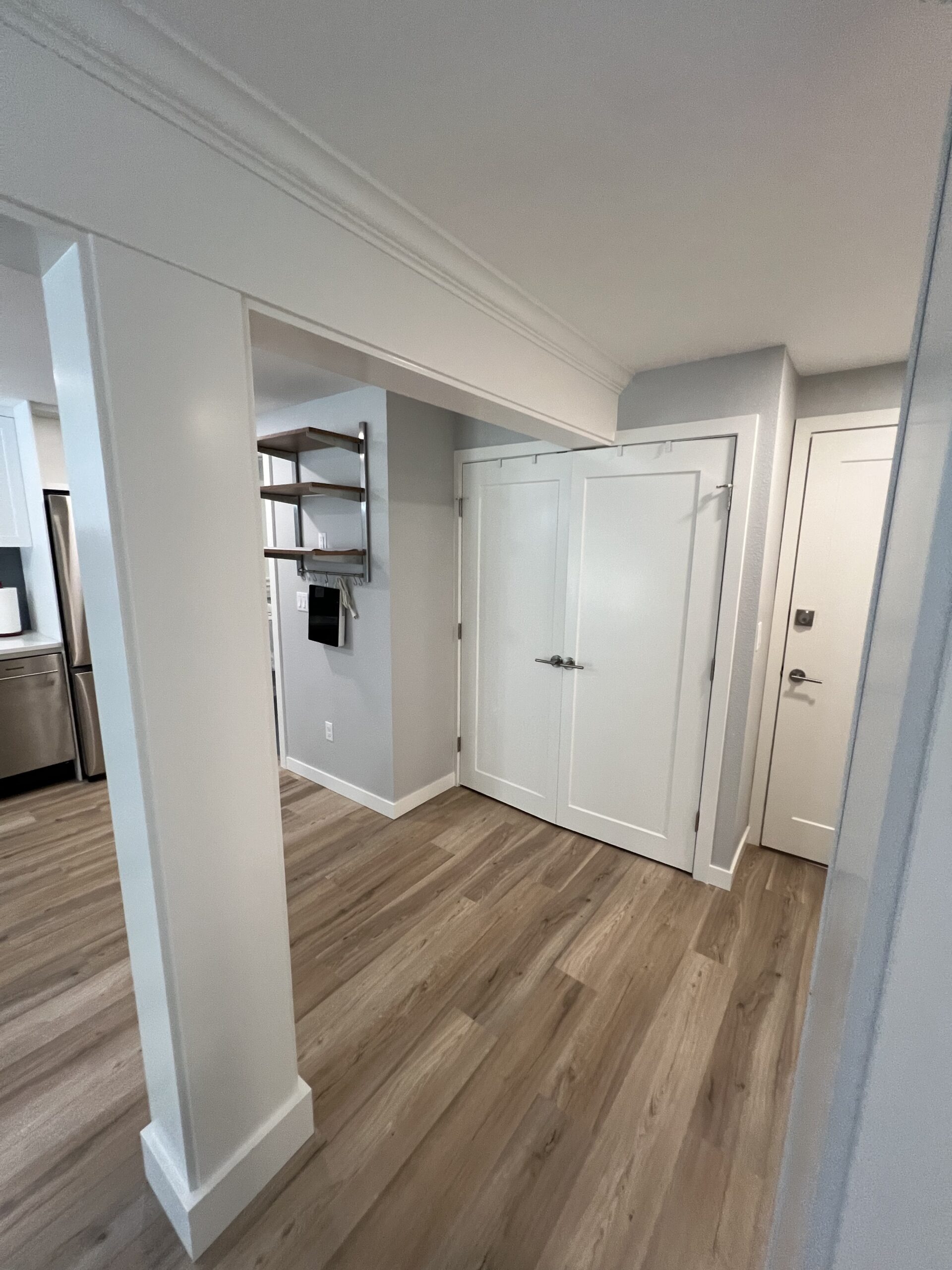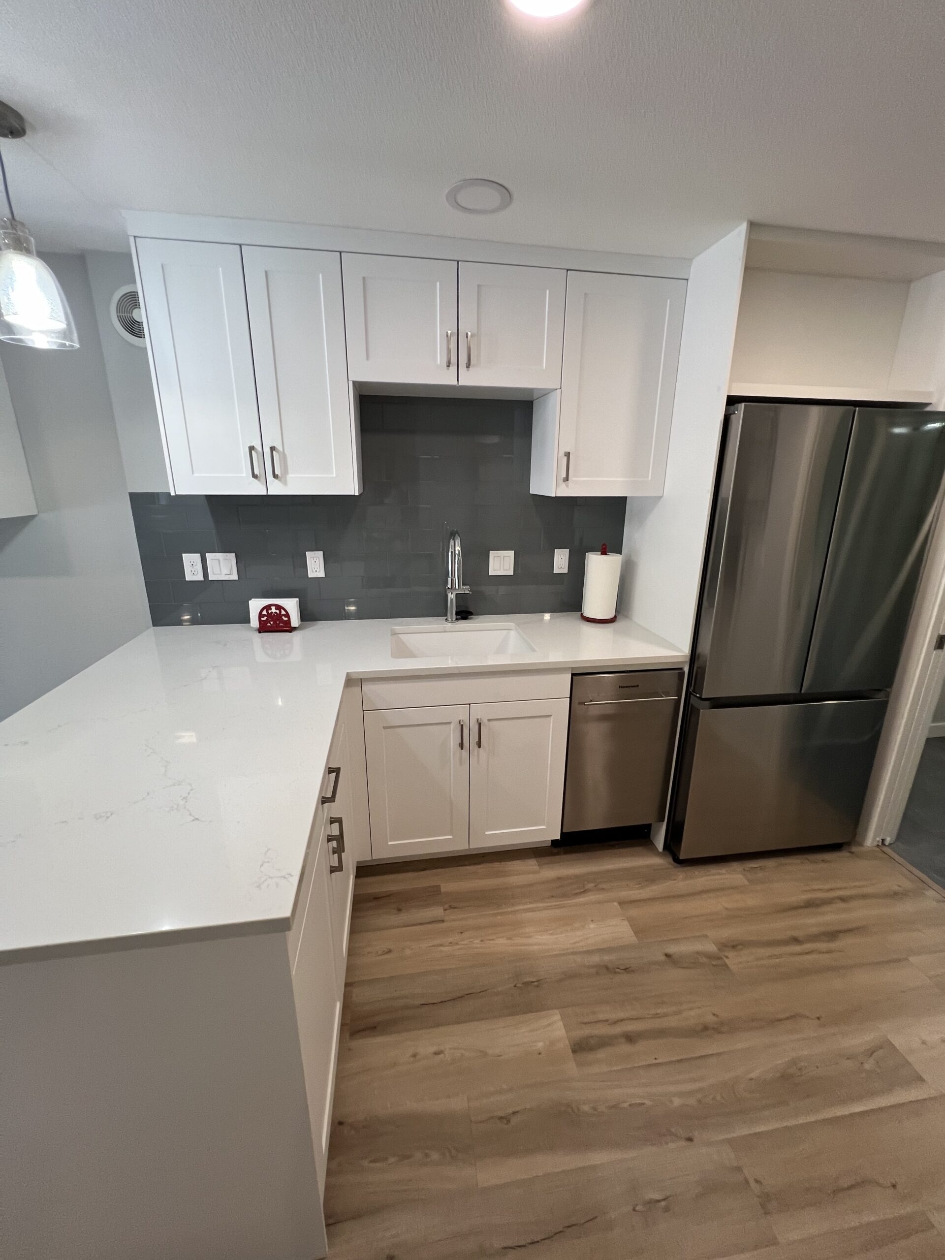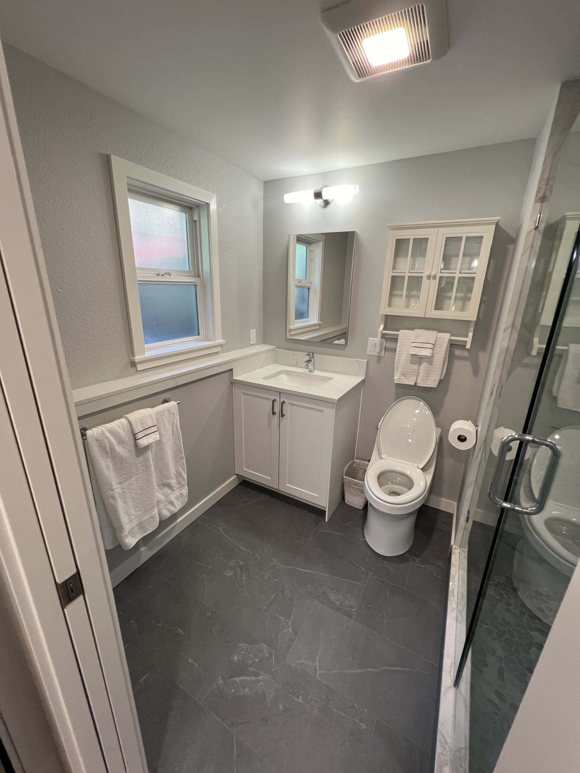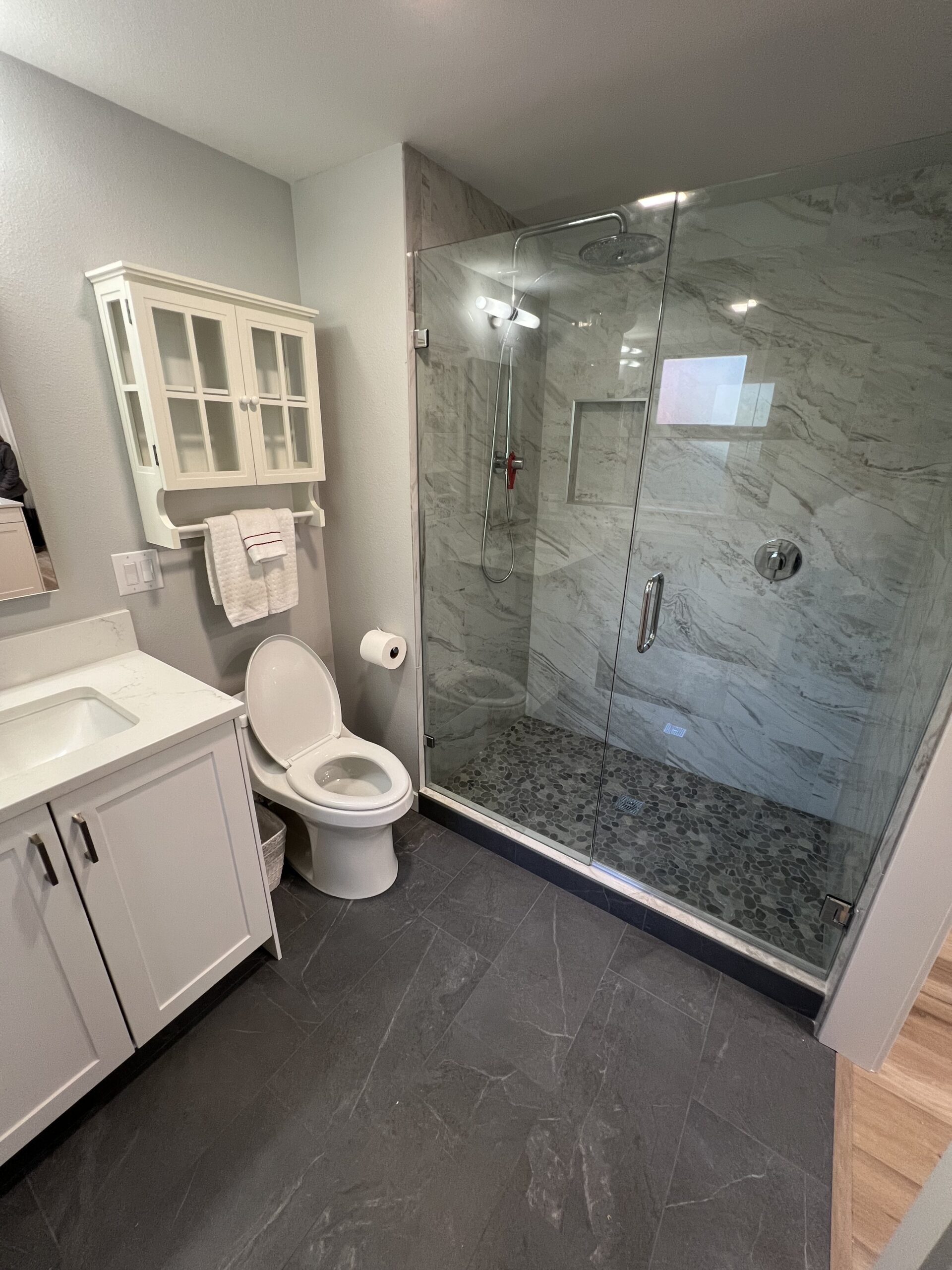 The client was looking to upgrade a basement area which included a divided living and sleeping area, large laundry/storage room and awkward bathroom into an ADU space for his mother. Design changes included swapping existing living and sleeping areas, rearranging the bathroom, reducing the size of the laundry room and adding a kitchenette. Existing free-standing closet system was repurposed to create a new sleeping area where the existing living room was and the existing sleeping area was modified to include a small living area for watching TV and addition of a new kitchenette with refrigerator, sink, dishwasher, microwave and small eating peninsula. A small hot plate will allow for simple meal preparation. The original bathroom included a pedestal sink, toilet (that was positioned so the tank was partially inset in an interior wall) and small 32”x32” shower. The reconfigured bathroom includes a full vanity, inset medicine cabinet mirror, toilet (which is entirely in the room) and a full-size 60”x36” shower. All new floors throughout (LVP in living area and tile in bathroom), new cabinets, millwork, lighting and paint.