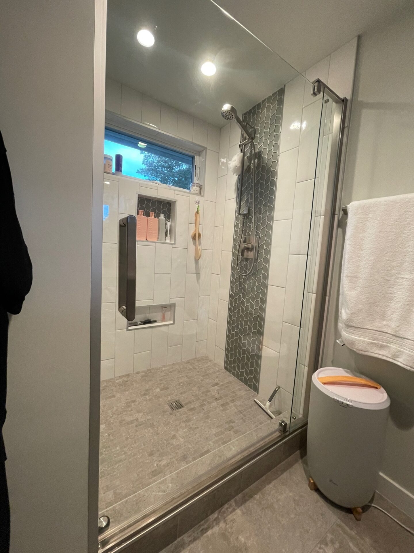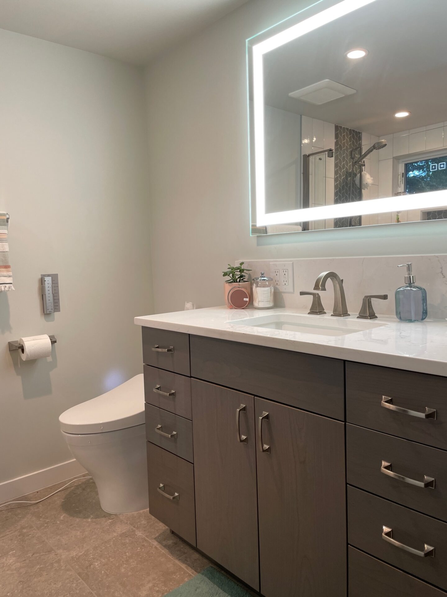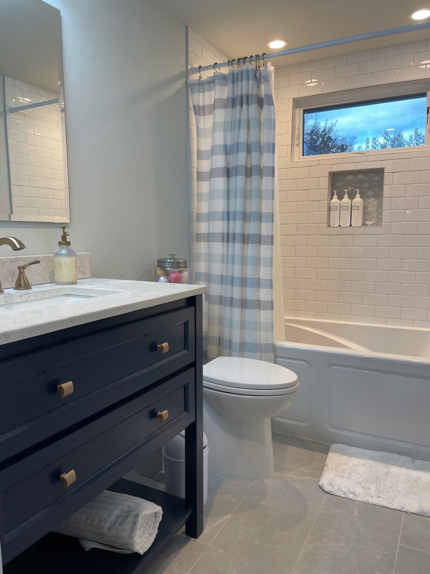 Materials used: Bellmont Cabinets, quartz countertops, Delta plumbing fixtures, tile, shower glass, Milgard windows