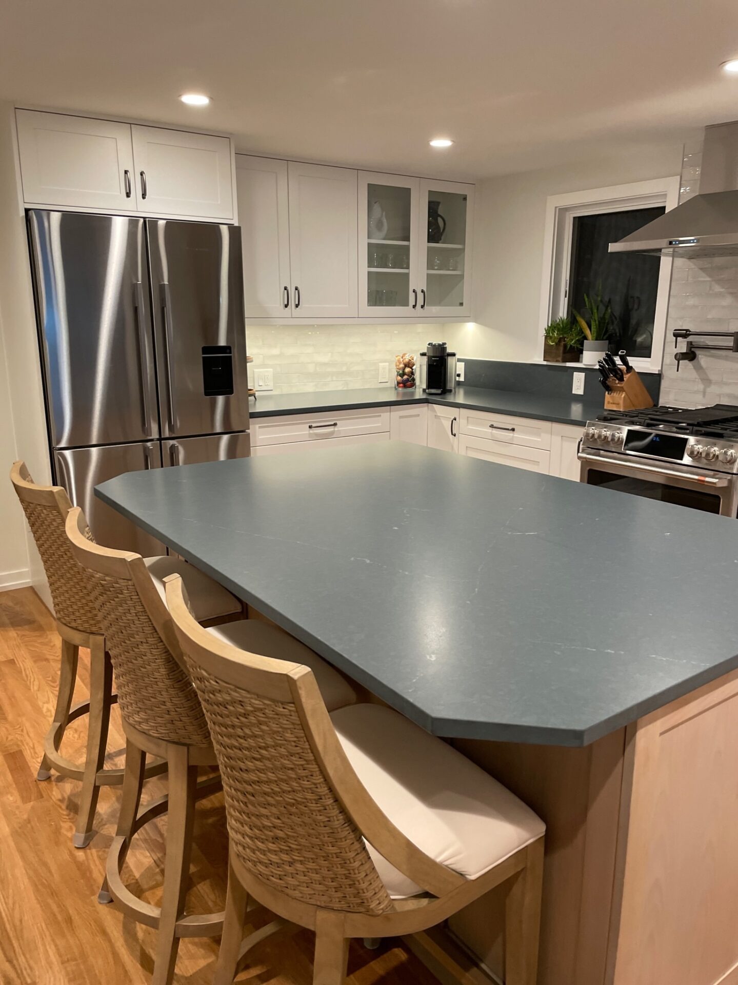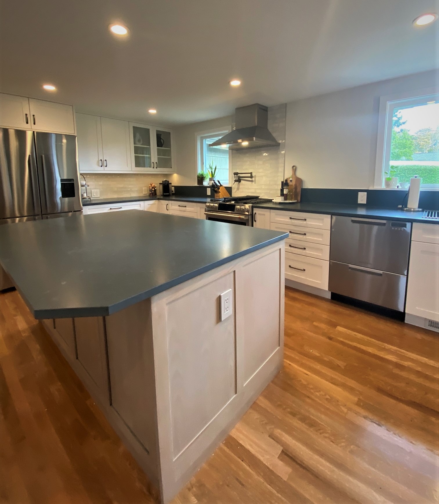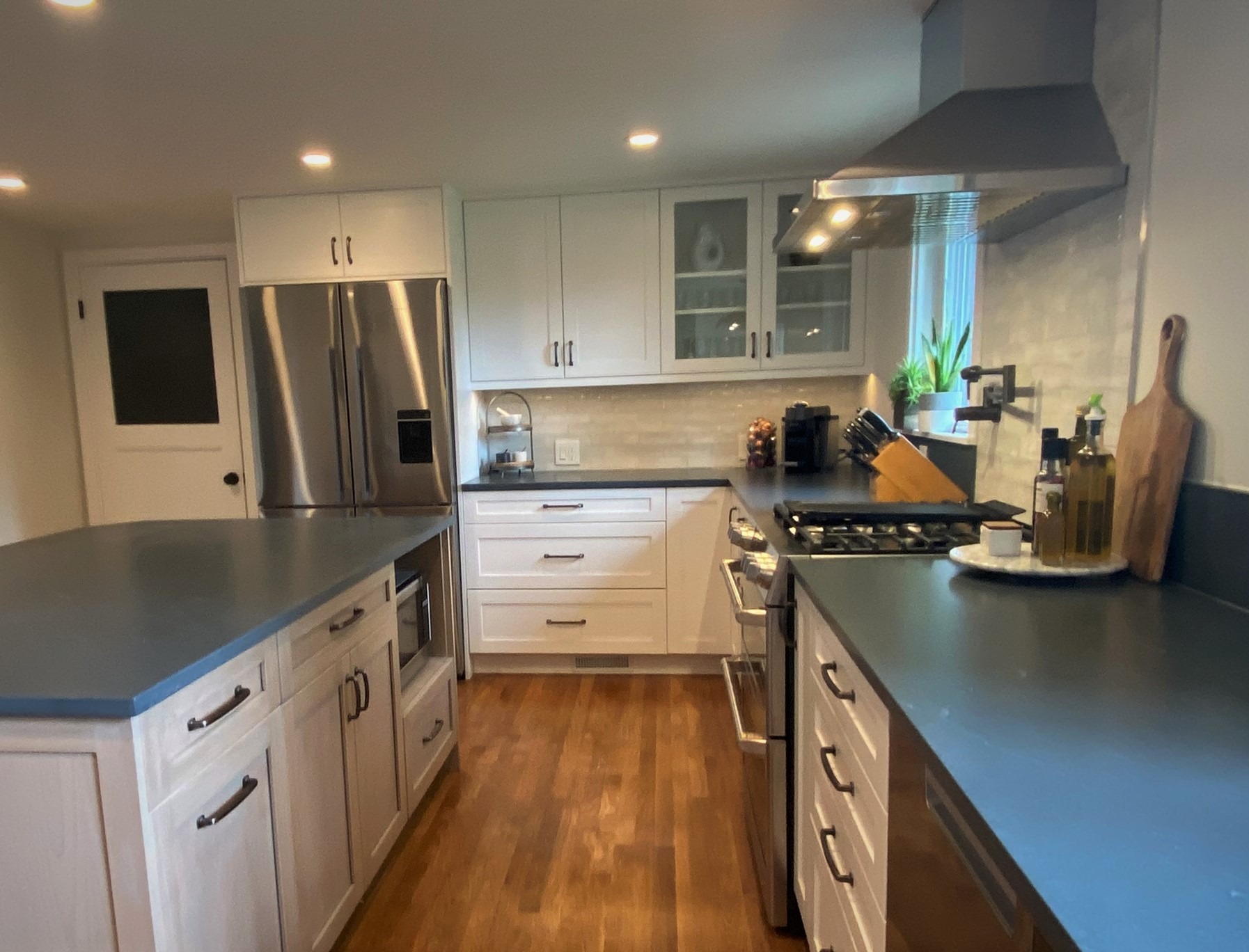 The existing appliances were relatively new so we reused the range, refrigerator, dishwasher and microwave. A new chimney style hood was added. Microwave was moved from the countertop to an inset slot in the island across from the range.