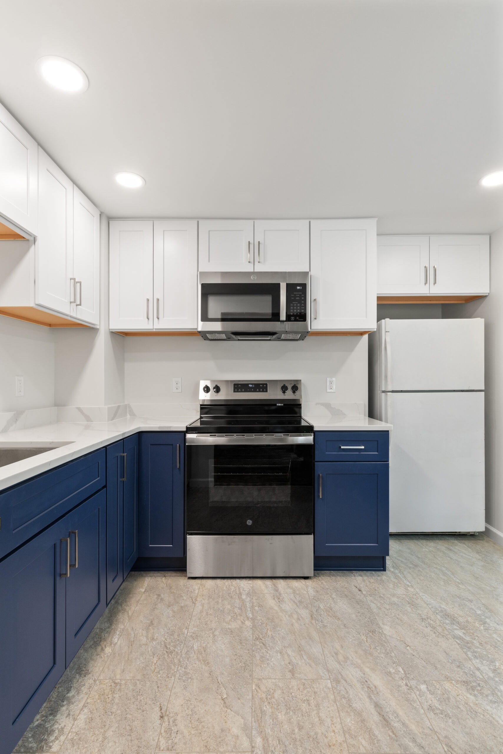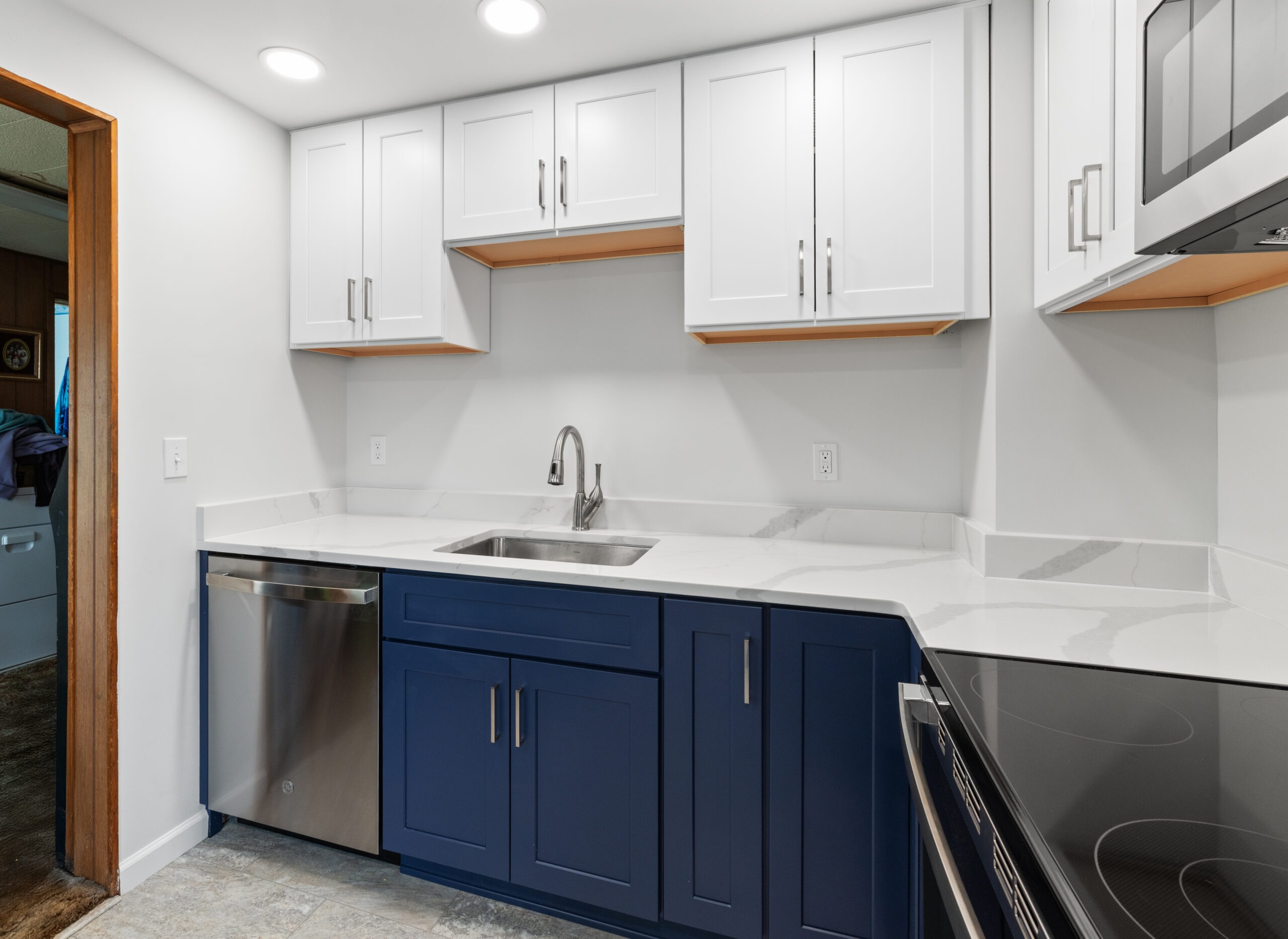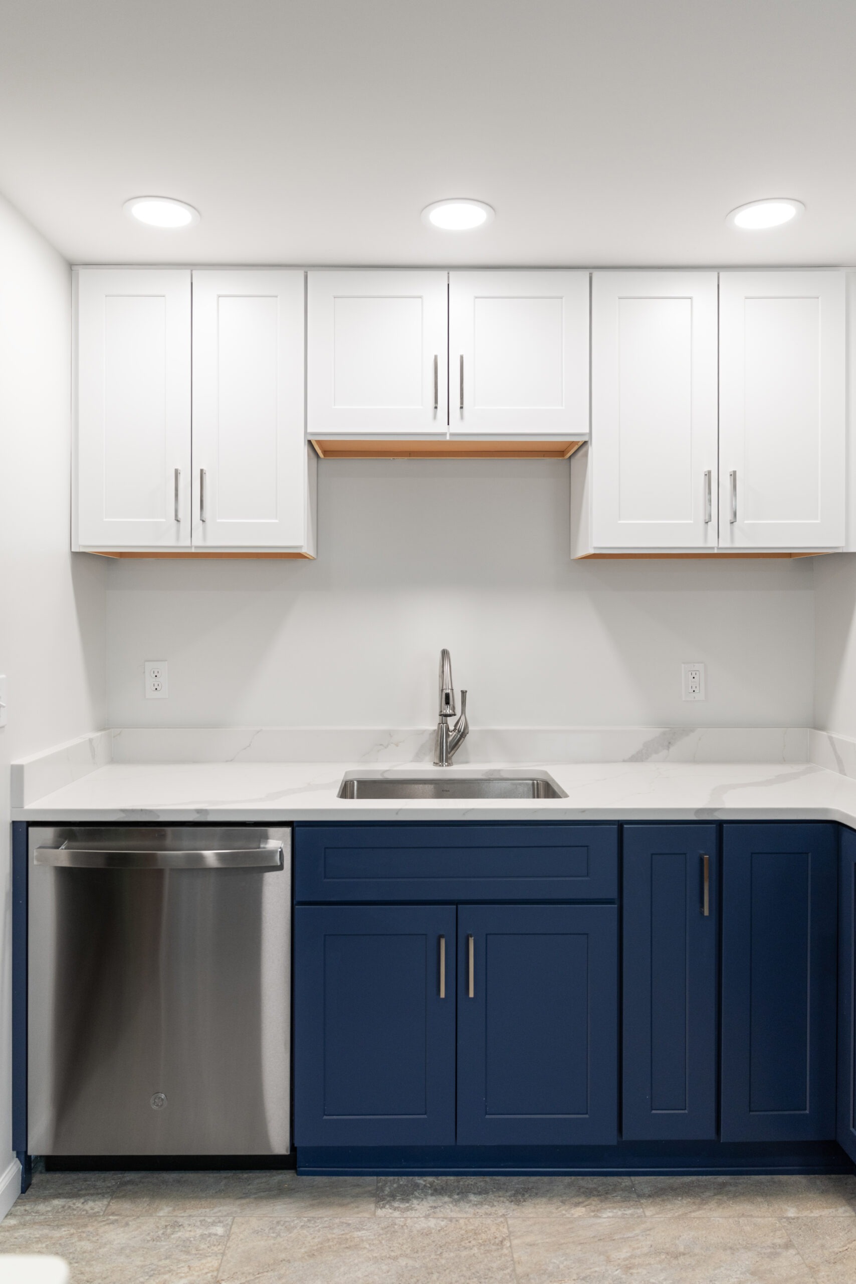 Materials used: Luxury Vinyl Tile, Quartz, GE Appliances, ProCraft Cabinets, Delta faucet