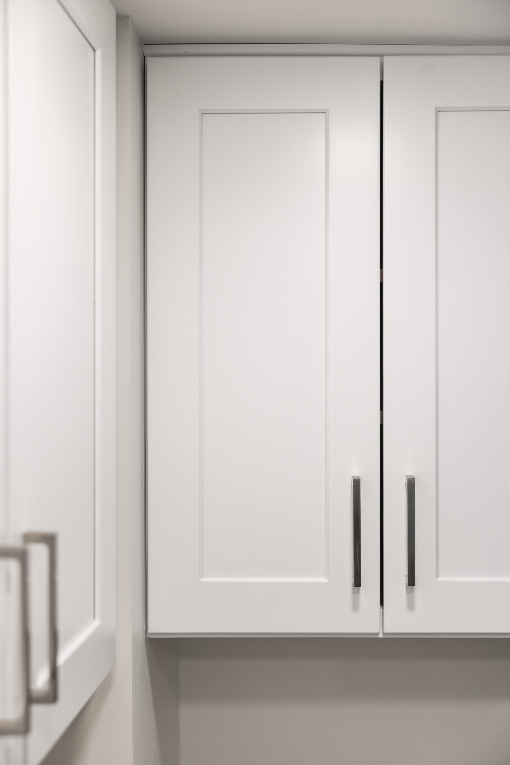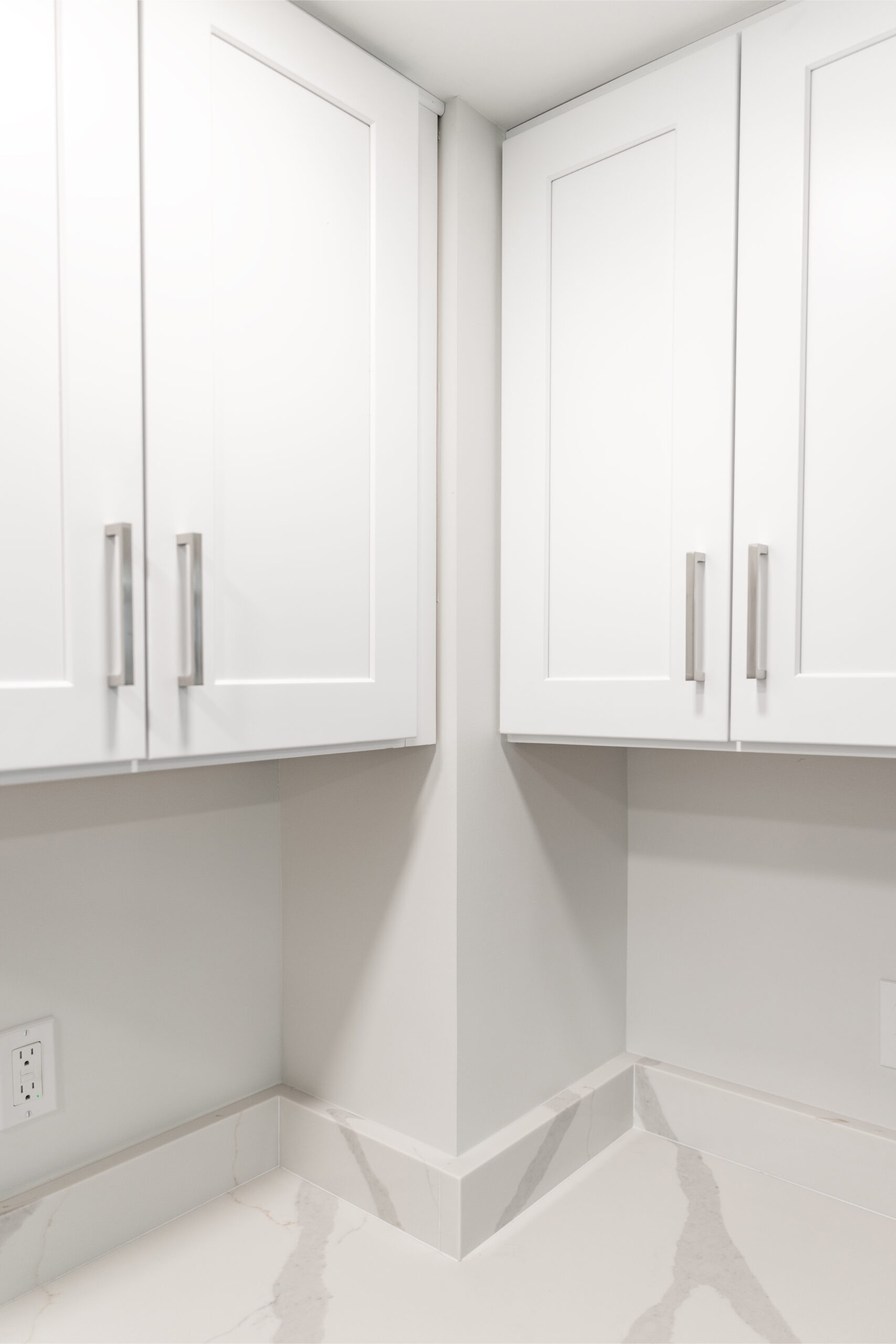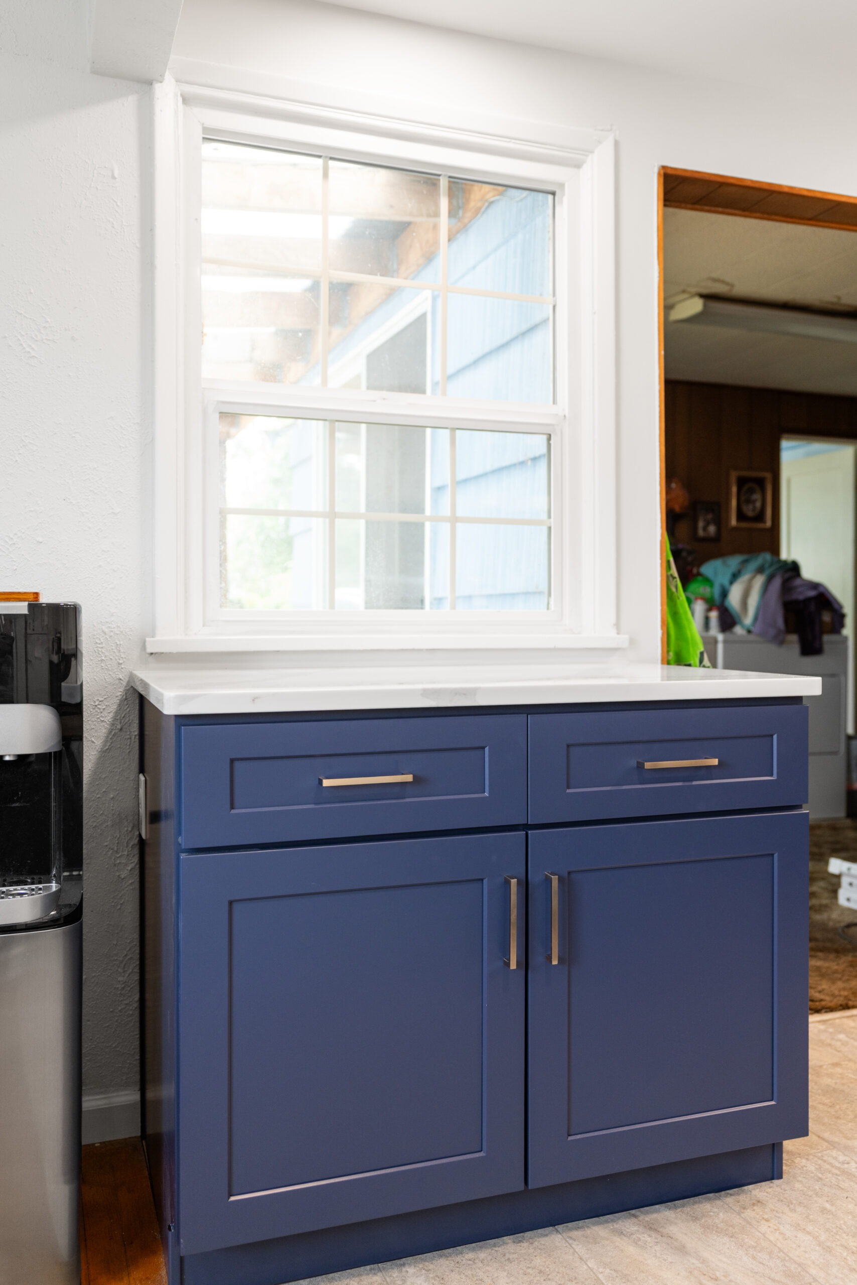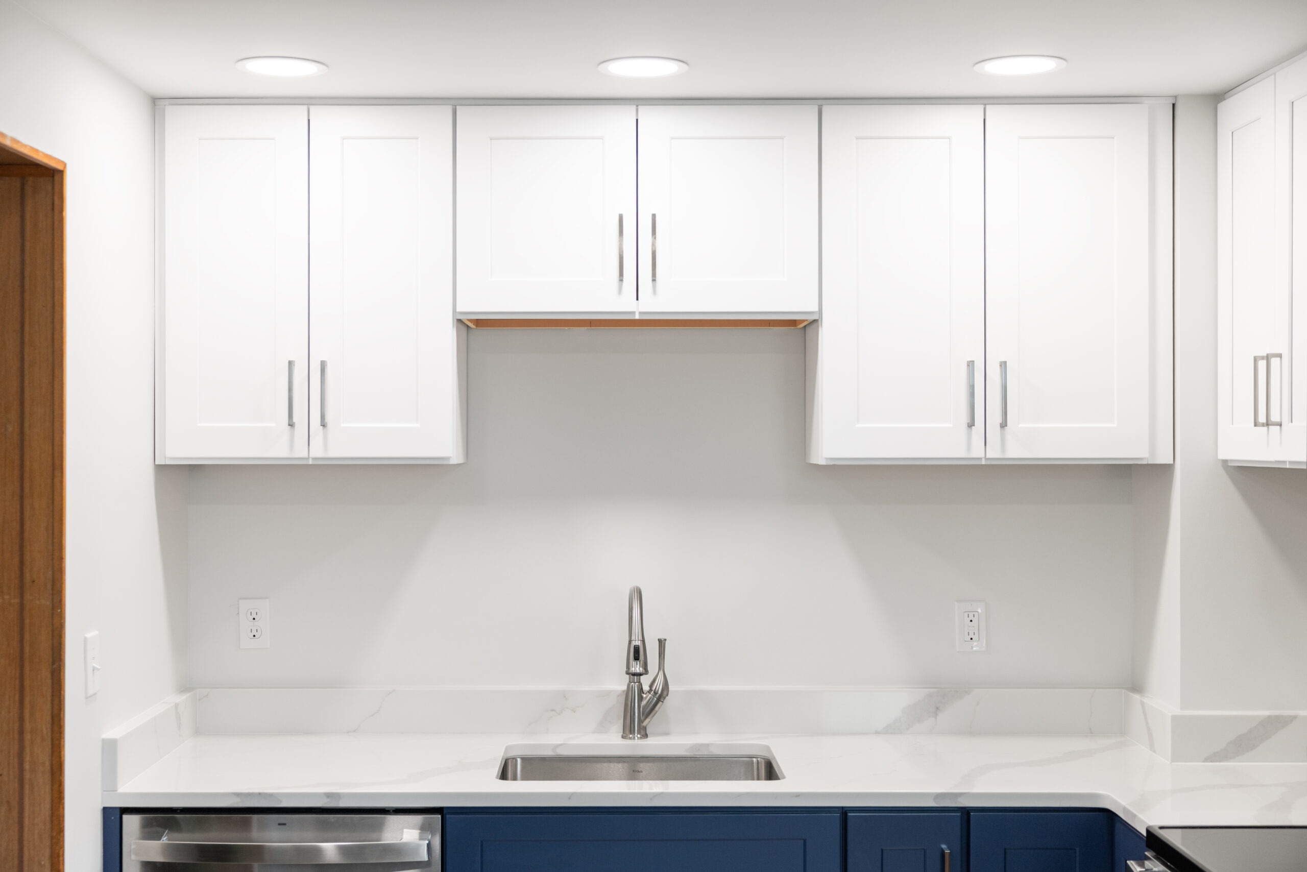All new cabinets throughout include a variety of drawers and shelving options along with uppers. The existing refrigerator stayed in the same alcove but now has a water supply for the icemaker.
